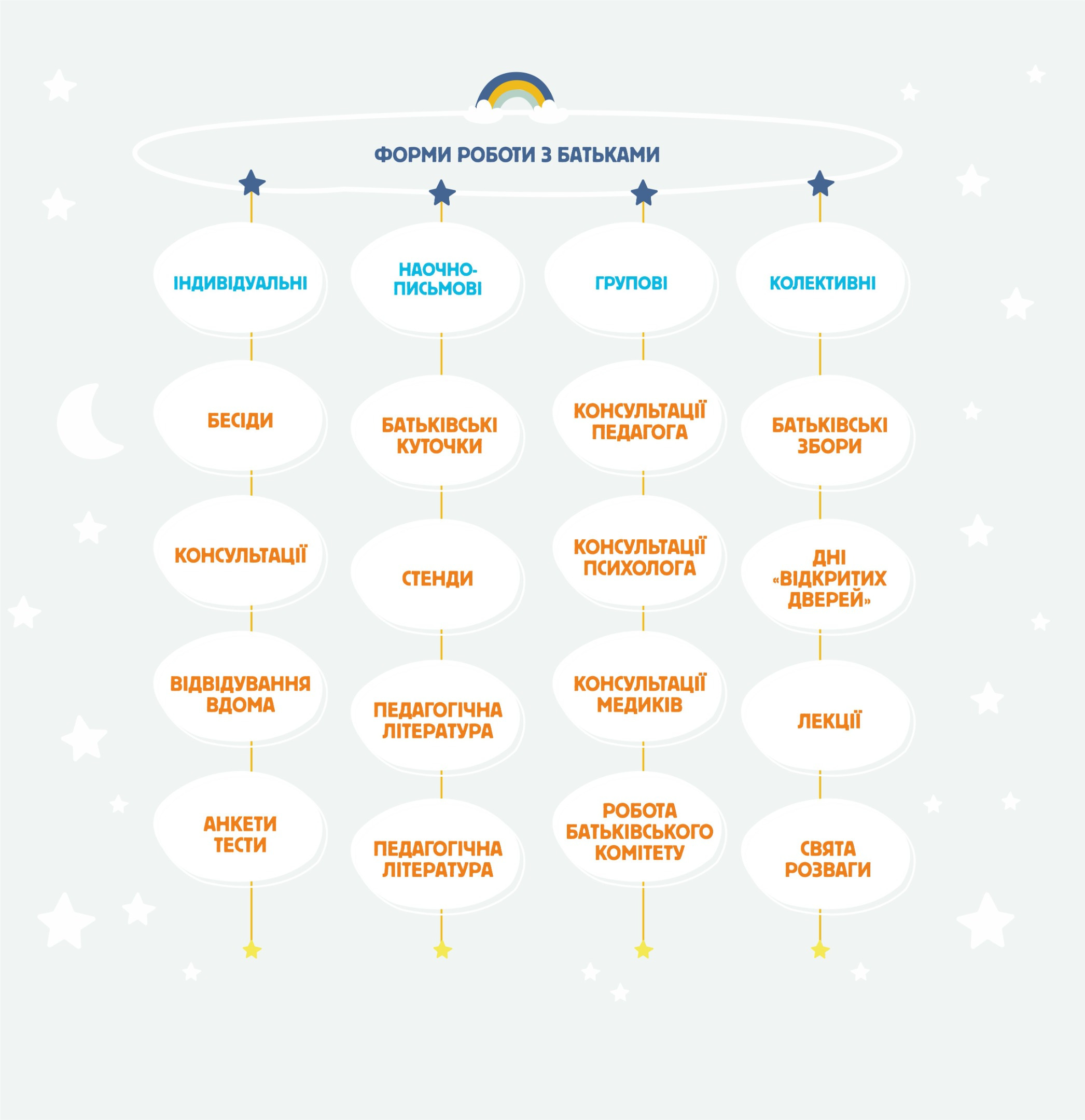 Робота з батьками в дошкільному закладі проводиться за такою схемою: